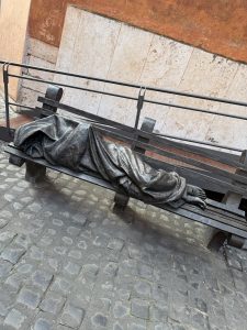 (Bild: „Homeless Jesus“ von Timothy Schmalz vor der Chiesa Sant’Egidio, Rom. Foto: privat)
